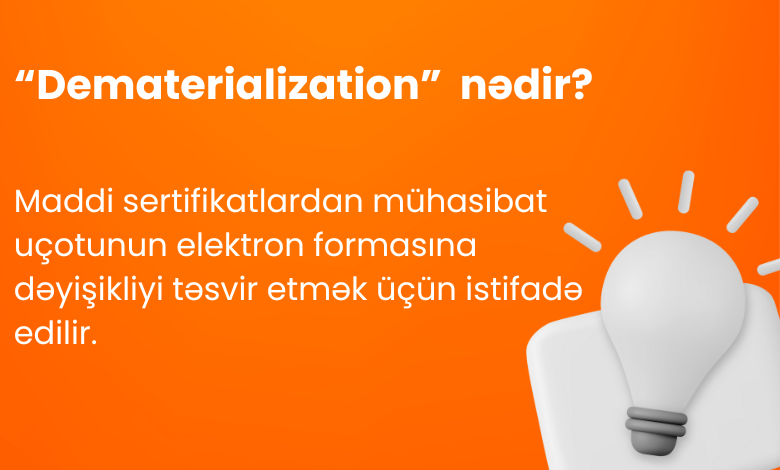 Dematerializasiya (həmçinin demat kimi tanınır) maddi sertifikatlardan mühasibat uçotunun elektron formasına dəyişikliyi təsvir etmək üçün istifadə olunan terminologiyadır. Fiziki səhm sertifikatlarından elektrona keçid artıq baş tutmağa başlayıb.